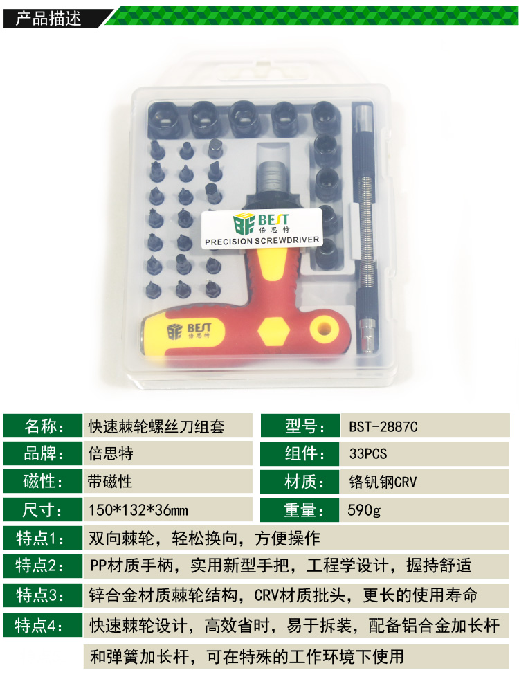 返回當(dāng)前位置: 首頁(yè) / 產(chǎn)品中心 / BST-2887C 33件套 快速棘輪螺絲刀組套
