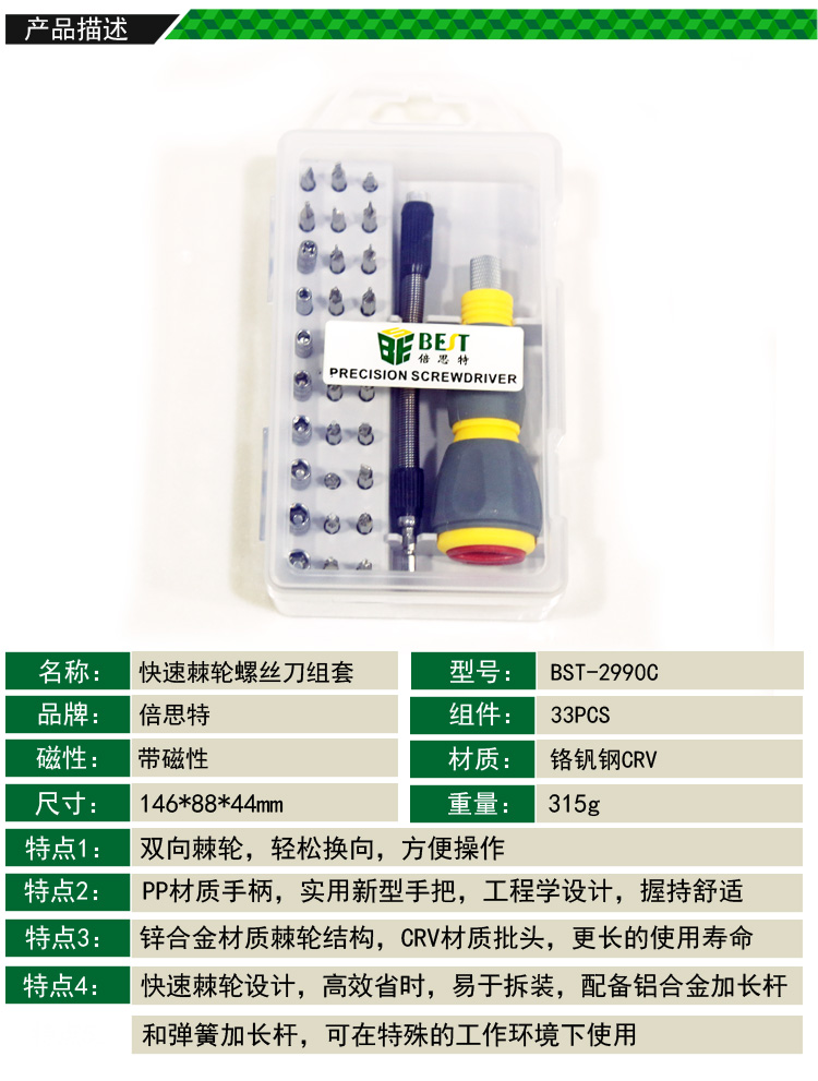 返回當(dāng)前位置: 首頁(yè) / 產(chǎn)品中心 / BST-2990C 33件套 快速棘輪螺絲刀組套