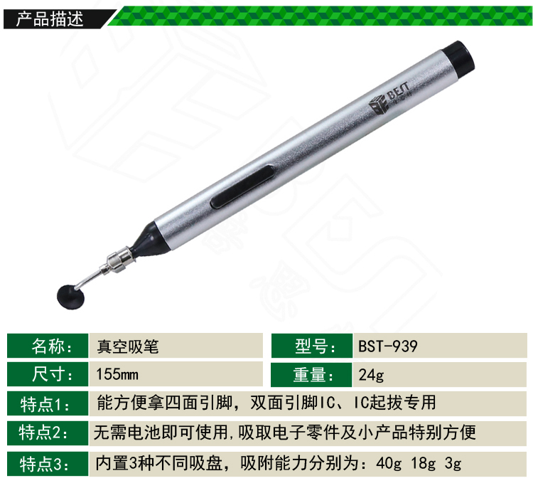 ? 產品名稱: 真空吸筆(銀)? 產品型號: BST-939? 產品類別: 吸錫器系列