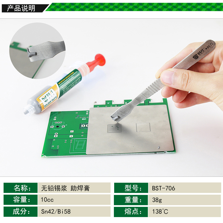 返回當(dāng)前位置: 首頁 / 產(chǎn)品中心 / BST-706 針筒式無鉛錫漿 低溫?zé)o鉛錫膏 焊錫膏 Sn42/Bi58 10cc