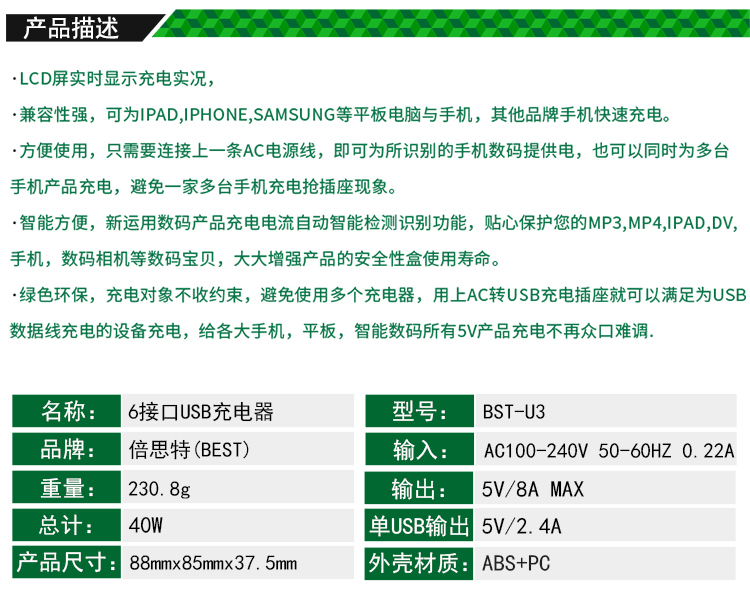 ? 產品名稱: 6接口USB智能充電器? 產品型號: BST-U3? 產品類別: 綜合類系列